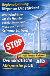 Hintergrund ist die Ausweisung von Windeignungsgebieten im Zuge des Wind-an-Land-Gesetzes. Die Entscheidungen hierzu werden von regionalen Planungsverbänden getroffen, deren Zusammensetzung nach Auffassung der AfD große Teile des Landkreises nicht angemessen abbildet. Besonders die Grundzentren bleiben bislang ohne eigene Vertretung – obwohl gerade dort die Auswirkungen der Planungen unmittelbar spürbar sind.