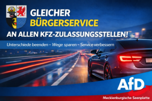 Die AfD-Fraktion im Kreistag Mecklenburgische Seenplatte fordert ein einheitliches Leistungsangebot an allen Standorten des Straßenverkehrsamtes. Derzeit bestehen erhebliche Unterschiede zwischen den einzelnen Zulassungsstellen – zum Nachteil von Bürgern und Unternehmen.