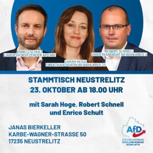Es begrüßen Sie unsere Direktkandidaten für den Landtag Sarah Hoge und Robert Schnell und stellen sich Ihren Fragen. Unterstützt werden sie von unserem Landesvorsitzenden Enrico Schult.